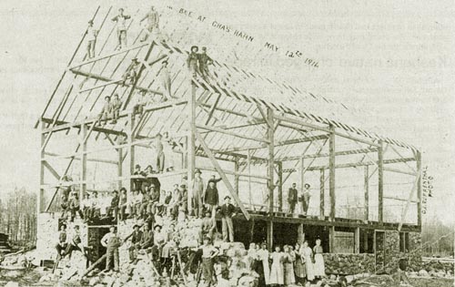 "A barn raising bee was photographed at the farm of Charles Hahn on May 12, 1916."