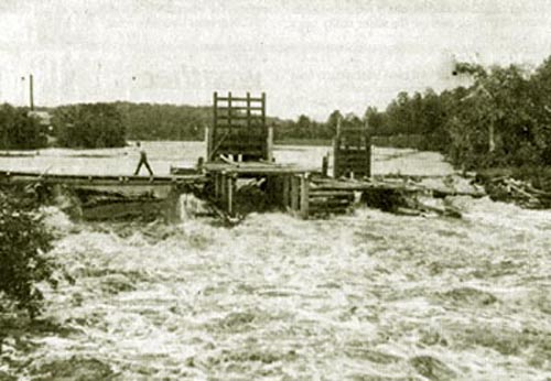 "This picture of the Caroline Dam shows the flood of 1912.  On the dam is Ted Buettner."
