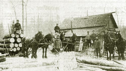 "The Red Lumber Camps at Bowler, owned and operated by Joe Behm.  This photo is from the late 1920's or early 1930's."